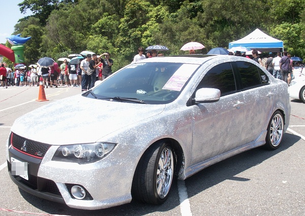 一進入停車場,就有LFC車隊的大型氣球拱門歡迎車友,報到處雖然人也非常多,但在熱心車友提供300隻冰棒,主辦單位也準備一大桶愛玉冰的貼心服務之下,大大消除了排隊車友的暑氣,報到處前更展示好幾台改裝特仕車,吸引了一大隊人駐足圍觀,尤其是兩台閃亮亮又「布林布林」的金銀雙剎最不得了,車友拿起相機就是一陣猛拍啊!
