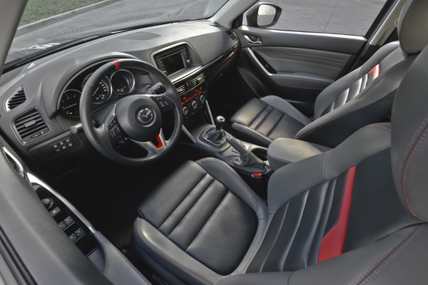 所有組成的侵略視覺感同樣充斥著內裝,黑色鑽孔皮革內嵌飾板,座落在以灰色人造皮革包覆的中控台上,並施以部份紅色點綴,與外觀車色相呼應。全皮革內裝包括有方向盤、排檔座、車門扶手、車門面板、與中央扶手置物箱等,而在前後座椅上也同樣以亮紅色縫線作對比。CX-5 Dempsey傳達了所有競技運動員的心跳、意志、與競爭的志氣。