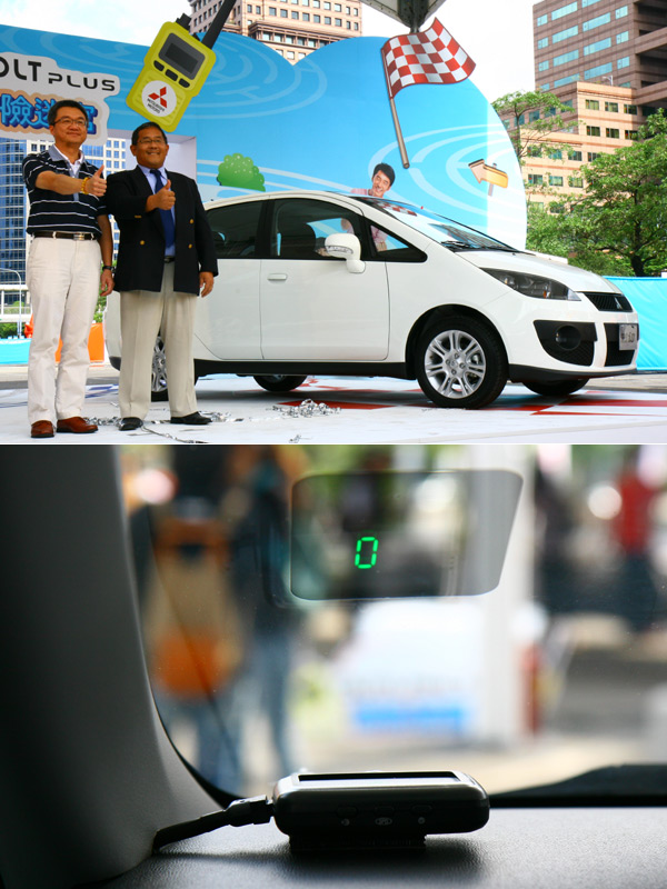 中華汽車陳昭文副總、日本三菱川崎雅彥經理與身旁的13年式Colt Plus iO合影。Colt Plus全車系則是追加了「多功能抬頭顯示器」。