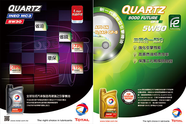 隨著2013年環保新紀元的到來,Total特別引進最新一代全合成環保低燃油耗頂級機油 – QUARTZ 9000 FUTURE GF5 5W30,通過ILSAC(國際潤滑油標準暨認證委員會)標準且授予GF5等級,不僅提供優異的高溫抗氧化穩定性,強化引擎性能,更有效改善燃油經濟效率。