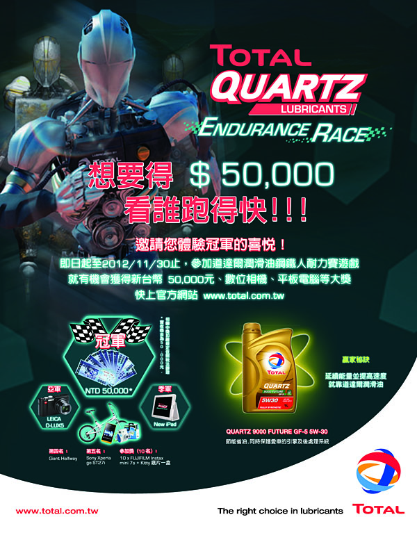 最後,Total極力推廣環保節能概念,專為QUARTZ 9000 FUTURE GF5 5W30設計一套遊戲程式,並於網路上舉行競賽活動 – Iron Man Game 鋼鐵人耐力賽,且提供高額獎金及優渥獎品,最高獎金新台幣五萬元,另有iPad、知名品牌數位相機等好禮,活動詳情請洽Total官方網站: WWW.TOTAL.COM.TW