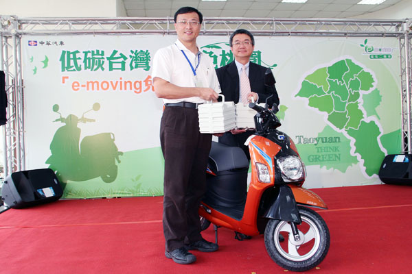 桃園縣政府環保局長陳世偉與中華汽車副總陳昭文一同體驗e-moving電池交換的輕鬆便利。