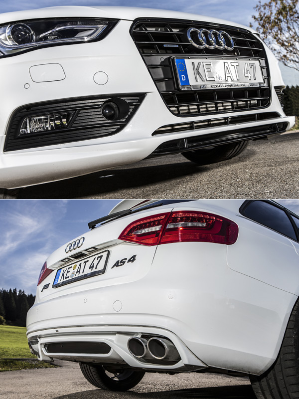 無須贅述地、ABT Sportsline也為A4 / A4 Avant開發一系列的空力套件組,包括前保桿下擾流、前葉子板嵌入式氣流導口、與車側側裙等,都給予全新ABT AS4優雅的輪廓展現;車尾則呈現充滿視覺衝擊的尾門尾翼、後保桿、與四尾管的設計。