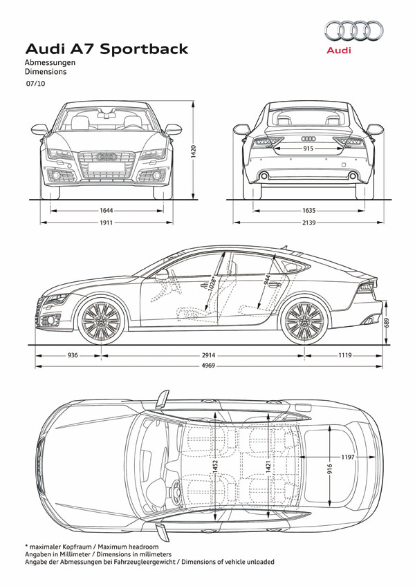大致分享對於A7 Sportback的市場定位與研發角度後,開始切入正題介紹。一如A5 Sportback,A7 Sportback乃是有著斜背設計的五門掀背車型,車身尺碼為4969×1911×1420mm,軸距長度為2914mm,從此數據看來,就如同Audi車系一貫的命名倫理,A7 Sportbsck車型大小介於A6與甫問世不久的新世代A8之間,因此要說此底盤是從哪位兄弟車型加以衍生?官方尚未有著明確說明,不就先把此A7 Sportback的車身基礎,定義為全新研發的平台吧!