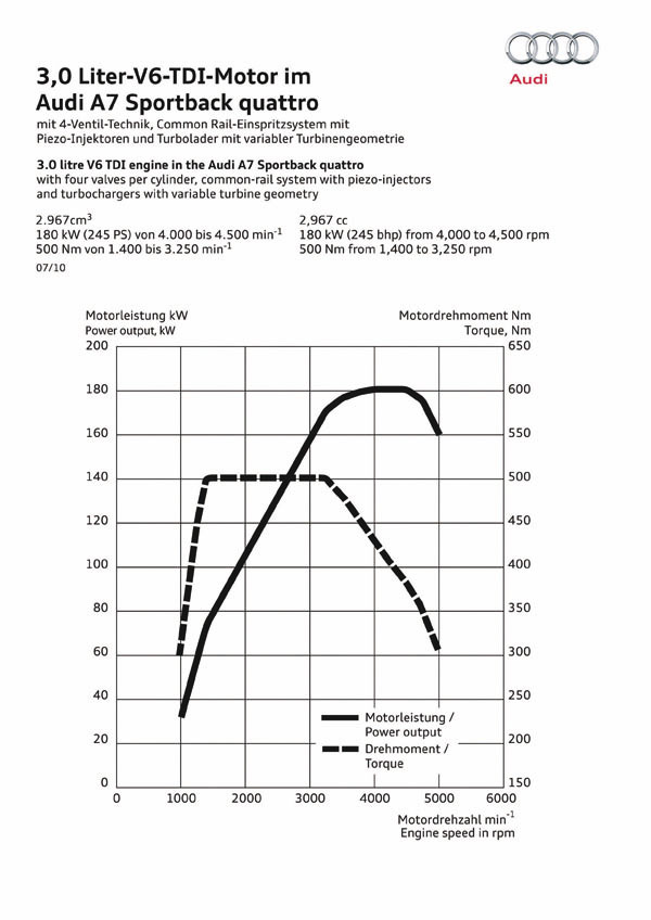 柴油車型方面,僅提供3.0L TDI單一柴油引擎,但有著兩種輸出版本,低輸出版本最大馬力為204hp,配上前輪驅動系統與Multitronic自排變速系統,使其可於8.1秒完成0-100km/h加速過程,極速達234km/h,平均油耗為18.9km/L,二氧化碳排放量則為139g/km,可說是A7 Sportback車系內最為環保經濟之車型。