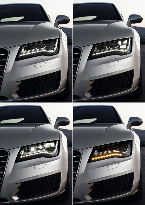 除了標配的氙氣頭燈外,A7 Sportback也提供LED頭燈設計,且透過創新的全天候照明功能設計,將傳統的霧燈功能整合至大燈內。