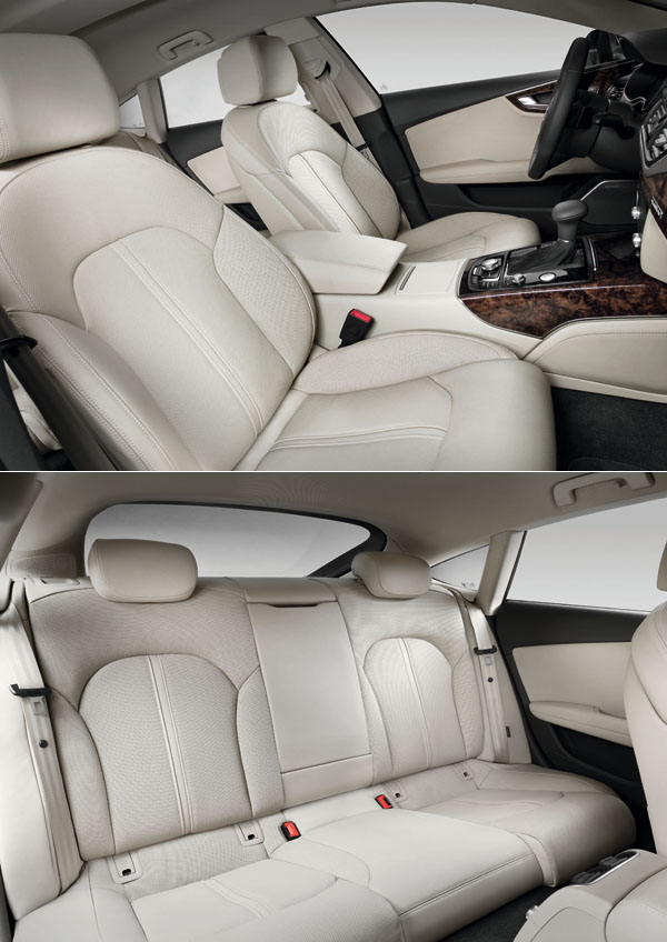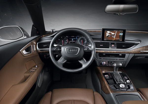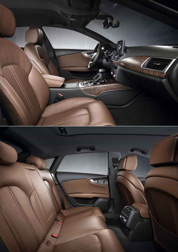 從車室內的設計線條中可發現,Audi原廠盡力的將A7 Sportback與A6或A8車型作出區隔,平整化的儀表與控台造型,稍微接近A8的格局,但整體中控台稍微的駕駛取向,與更科技化的手法,讓A7 Sportback有著與被賦予的五門轎跑車身分相呼應的一致;而在此基礎上,Audi也不客氣的對於A7 Sportback導入諸多科技配備,如列為標準配備的MMI車載資訊平台控制系統,列為選配項目的HUD等;雙圓儀表內,為提供駕駛更豐富的車輛資訊判讀,依照車型等級的不同提供5或7吋的液晶顯示螢幕,同時區分出單色或彩色等級;中控台上的6.5吋摺疊式螢幕為標準配備,而如果有選配MMI衛星導航系統的車款,則將螢幕升級至8吋規格,且還會具備有油Google所提供的網路服務。