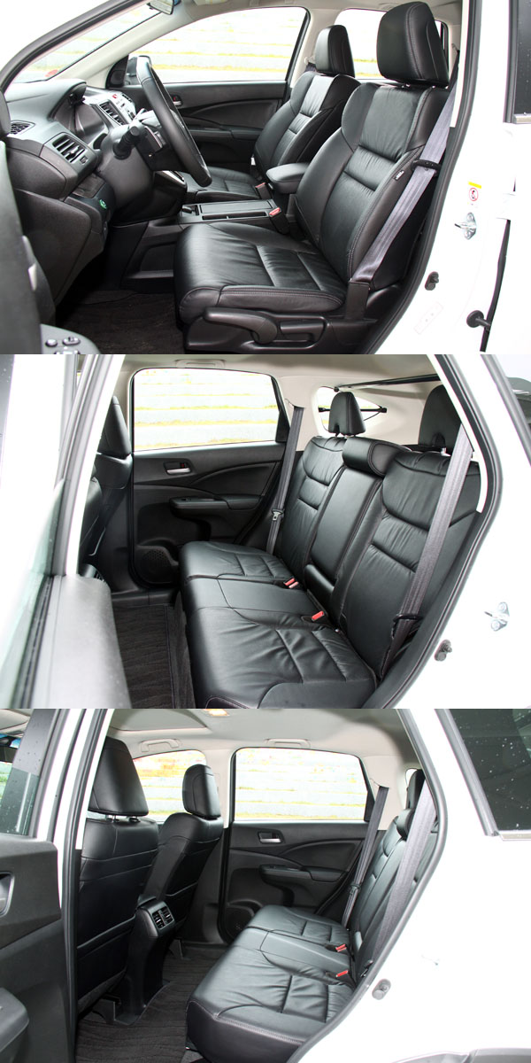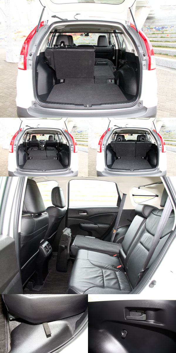 在全新CR-V的座艙中,即使整體設計都有了改變,但是在氛圍上卻還是充滿著Honda輕鬆低壓力的乘坐感,空間上,即使整體車身尺碼略為較前代車型略為縮減,但軸距長度則未改變,仍為2620mm,但透過良好的空間規劃,車內橫向寬度反而增加了75mm,縱向地長度更一舉增加了225mm,並且平均分配於客艙與行李艙使用,同時增加了乘客乘坐空間與行李廂的容積,行李廂容積因此增加了65L,另外,新CR-V也導入了One-Motion座椅傾倒功能,藉由行李廂中兩側的拉柄、或是座椅下方的拉環,直接將後座座椅打平,提供空間運用的高靈活性。