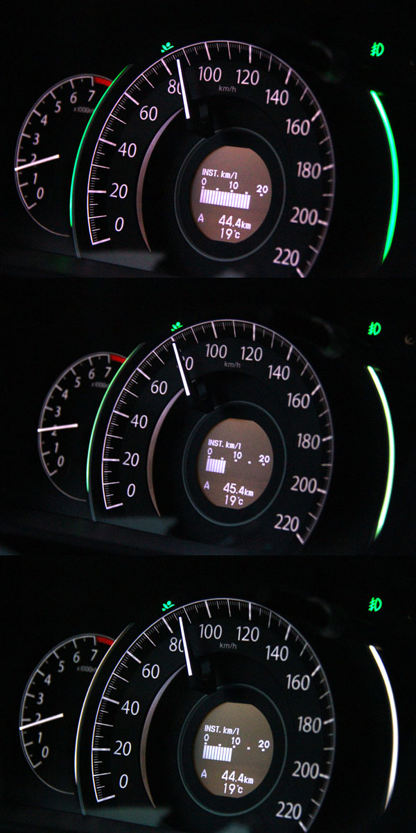 在ECON模式下,儀錶板中的節能導引功能會利用不同顏色光環提醒駕駛更準確地控制油門,以達到更好的節能效果,當燈號呈現綠色時代表較為節能,當油門深踩燈號也會漸漸轉為白色,則代表較為耗能。