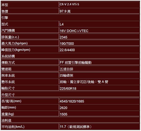 在全球都會SUV級距中擁有相當指標地位的Honda CR-V,也是Honda最重要的全球戰略車型,1995年問世至今已經演進至第四代車型,並且在2011年底發表,而台灣在等待了將近一年後,終於在台灣國產上市,在原廠規劃的四個車型等級中,便以本次駕的CR-V 2.4 VTi-S做為銷售主力!