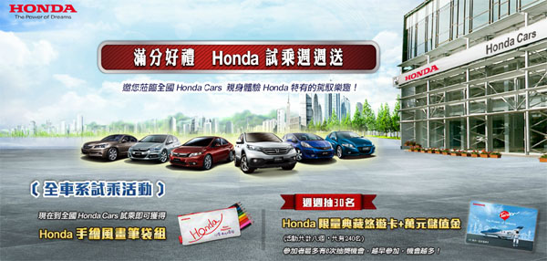 此外,Honda Taiwan滿心感謝顧客肯定,活動期間來店試乘,就送精美Honda手繪風筆袋組,週週再抽出30名幸運者可獲得限量典藏Honda悠遊卡,內含1萬元儲值金實用度百分百,與消費者一起打敗不景氣!Honda Taiwan消費者歡迎親臨全台Honda Cars賞車試乘,體驗Honda全車系車款魅力!