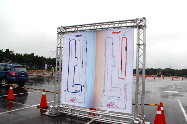 試駕體驗活動分為兩階段,一為左側之平面繞錐行駛,右側則為越野測試平台體驗。