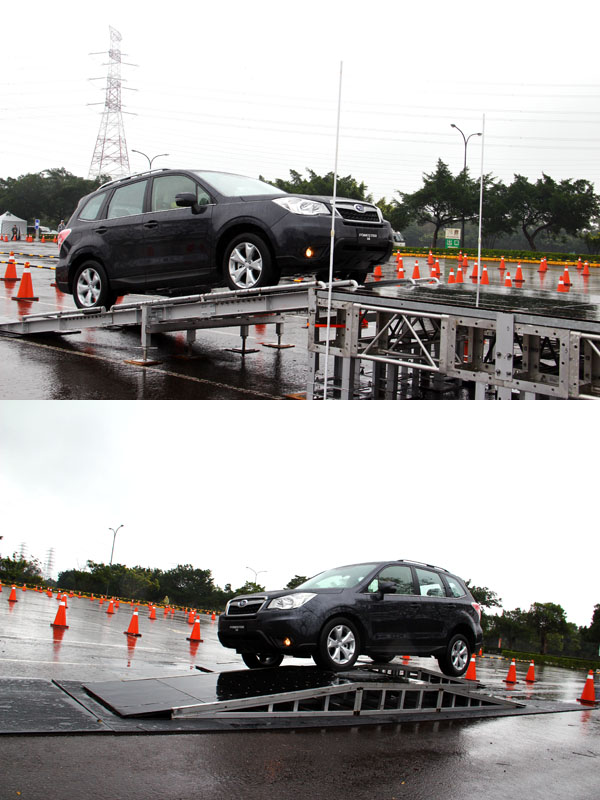 越野體驗平台的兩個關卡,上圖為斜坡附有滾輪之上坡滑動測試平台,模擬路面濕滑造成輪胎空轉,下圖為不對秤崎嶇路面測試平台,用以模擬地面崎嶇導致單輪懸空。