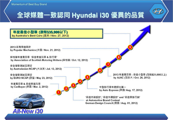 每年由澳洲頂尖的汽車專業人士挑選市場上的暢銷車種,經過極嚴苛試駕後,投票選出澳洲年度最佳車款。測試車款涵括從小型車到豪華車與4WD車款,全都必須通過澳洲最極端的路況測試,並依照操控、安全、價值…等眾多的項目予以評比,因此澳洲年度最佳車款「Australia’s Best Cars」較其他獎項更具公信力。Hyundai以優異的產品品質,旗下的Starex、ALL NEW i30以及Santa Fe紛紛勇奪2012澳洲各級距年度最佳車款。