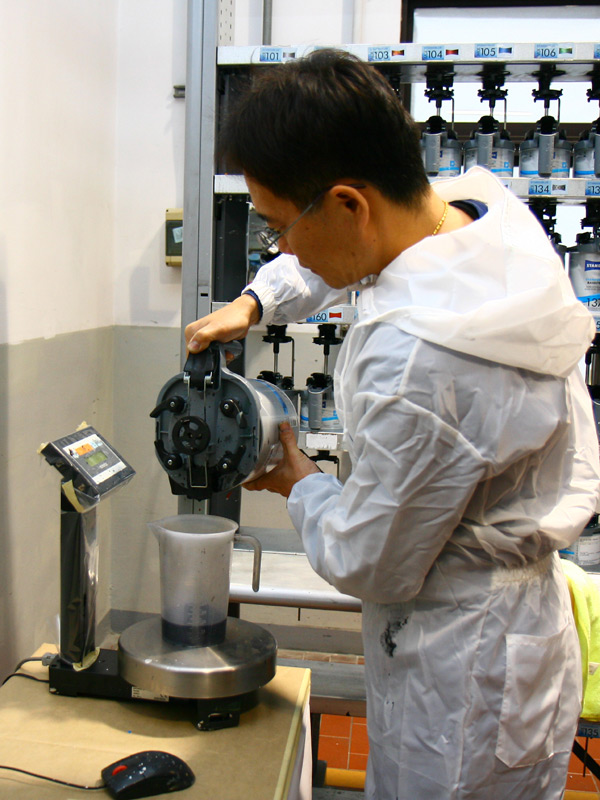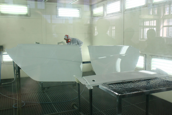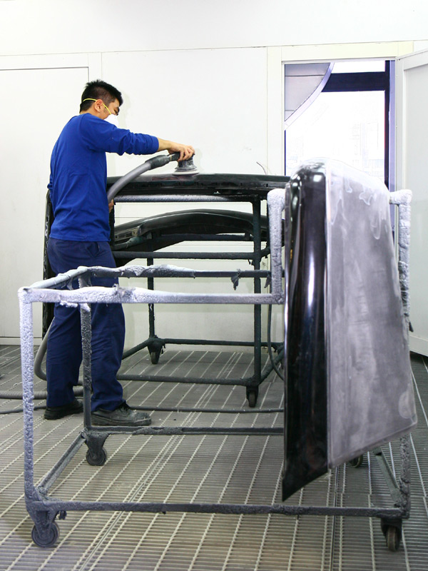 焦點拉回台灣賓士關渡服務廠,從四樓烤漆區開始,就能讓人感受到德國人一絲不苟的精神;以車體鈑金零組件的修復開始到完成,就得經過去污除鏽、補土、底漆、外漆… 等等多達八道的程序,從現場看到技師初始的打磨、補土、再打磨平整、到完全符合原車漆的調色、再進行最後噴塗,無一不是各司其職、且有系統、有效地完成每一項鈑金噴塗任務,師承德國原廠的專業,在此已表露無遺。