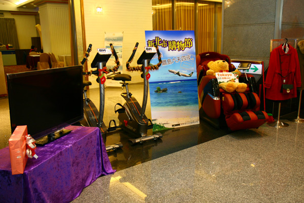 大同LED液晶顯示器、BH必艾奇健身車、世宇旅行社提供的關島六天四夜旅遊、與tokuyo提供的按摩椅等,都是新北市購物節的抽獎大禮。