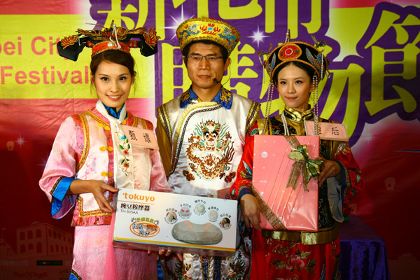 為宣傳新北市購物節活動,新北市政府也請到夜市叫賣達人葉昇峻先生(中),與兩位模特兒演出時下最夯的「甄嬛傳」情境劇。