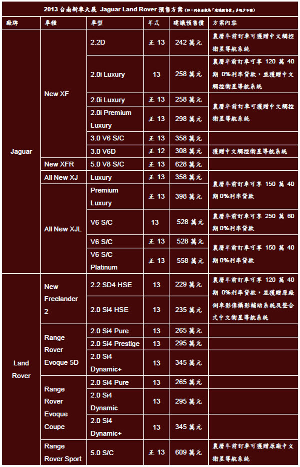 歲末年終,Jaguar Land Rover在2012創下了極優異的銷售成長佳績,總體銷售量較去年成長達100%,絲毫無畏大環境的影響,在逆勢中開出了亮麗紅盤,足見新世代Jaguar Land Rover車系不但在國外備受讚揚,在國內也受到層峰車主們一致的肯定。而在新年交替之際,Jaguar Land Rover更在甫風光落幕的2013台北車展中頗有斬獲,以搭載全新2.0 i4 Ti的New XF 2.0 Si、搭載全新3.0 V6 S/C引擎的New XJL V6 S/C,和首度搭載極致高效能動力,並率先在國內亮相的New XJ Luxury,以及內外進化並搭載全新動力的New Freelander 2 2.0 Si4 HSE、全新13年式Range Rover Evoque Coupe/5D Dynamic+、全新13年式Range Rover Sport 5.0 S/C以及10年、11年國內七人座全尺碼柴油LSUV銷售冠軍─Discovery 4 3.0 SDV6列陣展場,壯盛的車系陣容展現英倫頂級豪華品牌的王者氣勢,吸引了所有層峰買家的目光,不但在歲末年終為Jaguar Land Rover在2012年開出了全年銷售正成長的佳績,更為即將到來的2013年作了最好的準備,迎接下一年的銷售成長;而台灣總代理九和汽車特別在本次台南車展,將Jaguar Land Rover於台北車展的展出車款移植府城,引領南台灣所有品味不凡車主們以及車迷們,聆賞英倫奢華工藝和極致效能動力的精湛呈現。