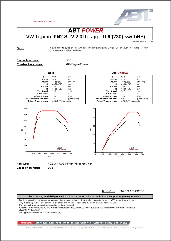 針對2013年式的Tiguan 2.0 TSI六速自排變速箱車輛,ABT Taiwan引進了德國原廠的升級程式,將原先的180bHP動力提升到230bHP,扭力也從280牛頓米提升到330牛頓米,可說是相當有誠意的動力提升表現。