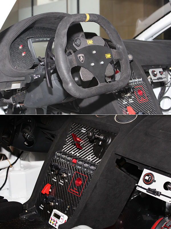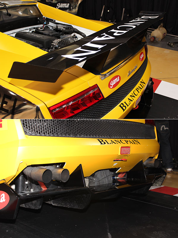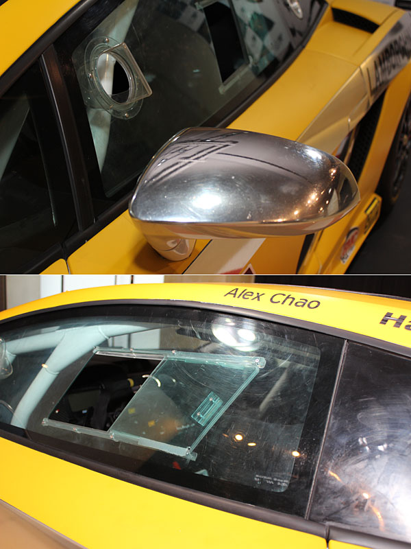 全車貼上黃色與亮銀車貼的Gallardo Super Trofeo,大致上維持市售車規格,僅針對安全性、操作介面、底盤調校等處依照賽事規格改裝,圖中的車窗玻璃便改為聚碳酸酯材質,擋風玻璃也相同。