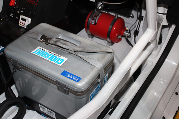 前方紅色筒身為滅火器,而銀色箱子則為賽車手身著冷卻衣的冷卻系統。