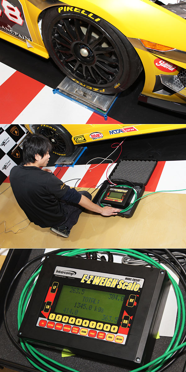 測量車身配重則利用專用的電子稱重儀,最下圖顯示的是四輪配重,設定時須要先請賽車手坐至駕駛座,並利用懸吊調整的方式調整出左右前輪相同的重量負擔,後輪則因引擎位置與油箱等重量因素,難有左右相同的調整。