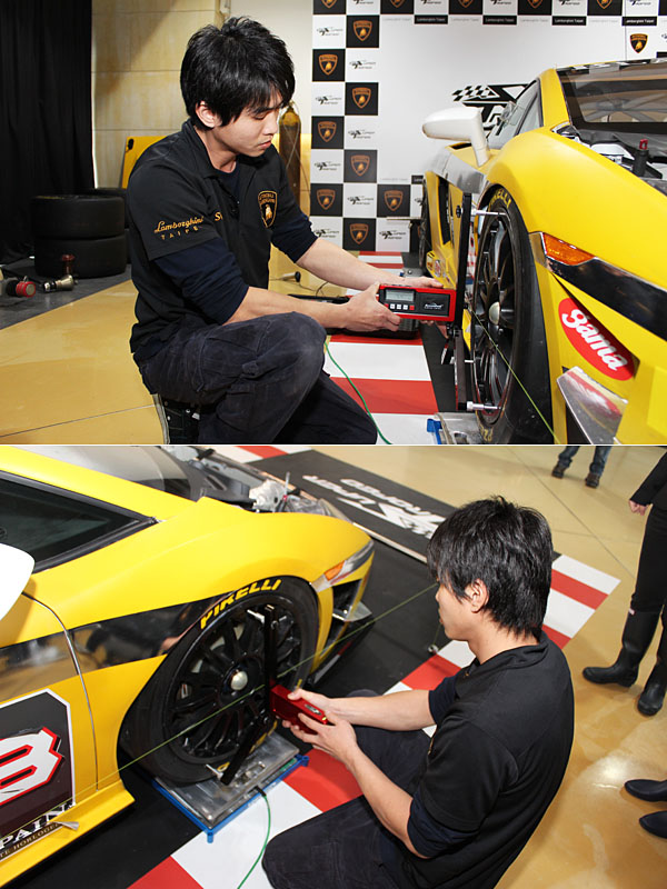 而在結束了2012年系列賽事後,嘉鎷興業也將其出賽征戰的第38號Gallardo Super Trofeo賽車運回台灣並於第一時間對媒體公開展示,除了可從賽車身上的使用痕跡約略窺見賽事之激烈外,為進一步的呈現比賽時的嚴苛環境與分秒必爭、錙銖必較的激烈比拼,也邀請於2012年參加賽事巡迴的專屬技師現場示範,包含如何執行野戰級的車輛定位設定、車身配重調整、輪胎拆卸更換、前防傾桿調整等,同時也請技師針對車輛與市售車款的不同設定加以解釋,比較出市售車與嚴苛賽道環境的差異處。