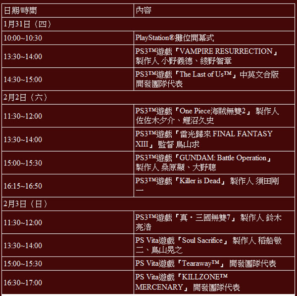 PlayStation攤位開幕式將於展期首日(1月31日)由索尼電腦娛樂亞洲區總裁 織田博之,與PlayStation明星遊戲角色「戰神 克雷多斯」以及「多樂貓」等一起揭開序幕,精彩製作人舞台活動將接力展開!除了玩家朋友所熟悉的日本遊戲製作人外,還有首次訪台的多位遊戲開發團隊,到台灣和玩家朋友們互動。玩家們不但可以目睹製作人風采,參加製作人舞台活動將有精美舞台贈品,更將提供PS Vita遊戲『Soul Sacrifice』製作人稻船敬二的簽名海報,給於電玩展現場排隊和預約『Soul Sacrifice』PS Vita限定版主機同梱的前30名玩家唷!