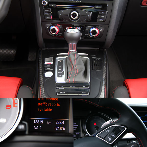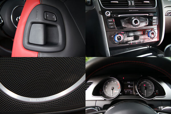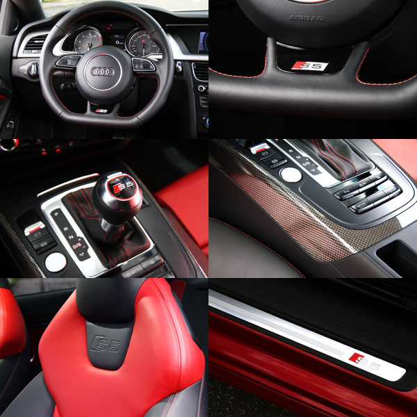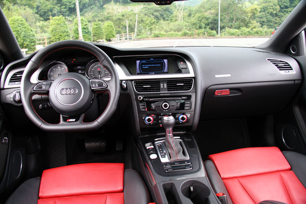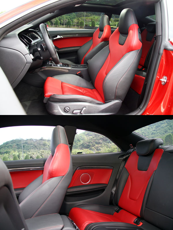 S5 Coupe將Fine Nappa真皮包覆跑車座椅列為標準配備,Audi原廠提供了豐富齊全的客製化選配,包括多種全新內裝顏色和飾板款式等內裝部品與材質選擇,試駕車輛便選擇了最能代表高性能車的紅、黑色組合。