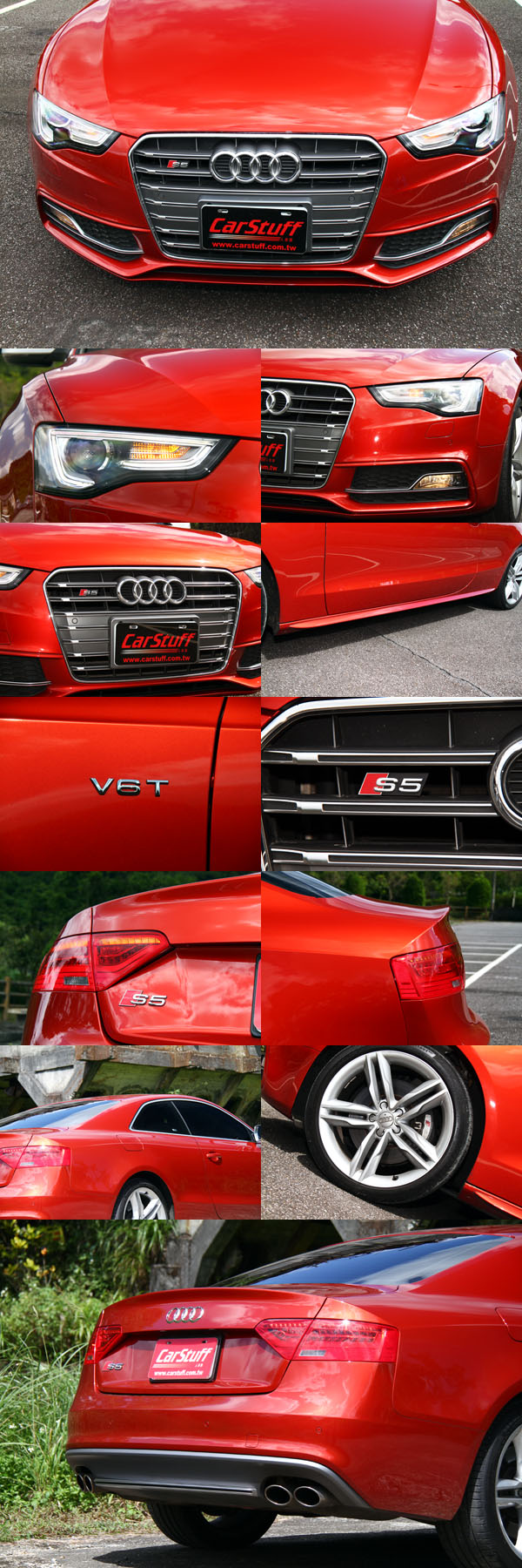 S5 Coupe改款後,換上了全新設計的前/後保險桿、採用鑽石形切角設計附亮黑色烤漆橫柵的新款Audi Single-frame水箱罩,搭配稜角分明的全新楔型燈組,內含了氣體放電式頭燈以及整合Audi最先進的光纖導引LED光源科技極線LED識別燈,是Audi新世代車款最容易辨識的特色,車側由車頭向後延伸至車尾所刻劃出的上、下兩道側肩線,以及車頂同步融合了流暢的弧線造型元素,搭配車尾部份全新LED後尾燈組,則是劃出了S5 Coupe修長且精煉的身形。