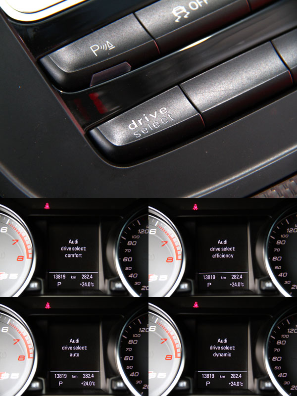 S5 Coupe也配有Audi drive select 可程式車身動態系統,該系統會針對油門訊號、轉向、懸吊系統等進行調整,在不同模式下賦予車輛不同的調性,在dynamic模式中,可以明顯感到懸吊變得更為硬朗,方向盤手感變重,變速箱換檔時間變短等狀況,給予駕駛更明顯的駕駛回饋,以應付更激烈的操駕,而相對在comfor與efficinecy模式下,車輛會變得較為舒服,而且油門訊號也會降低,提供更節能的行駛條件,但基本上若你不想時時刻刻去調整這套系統,切至auto模式,電腦自然會依據油門深度等參數自行判斷車輛行駛狀態,將各系統做最適切的調整。