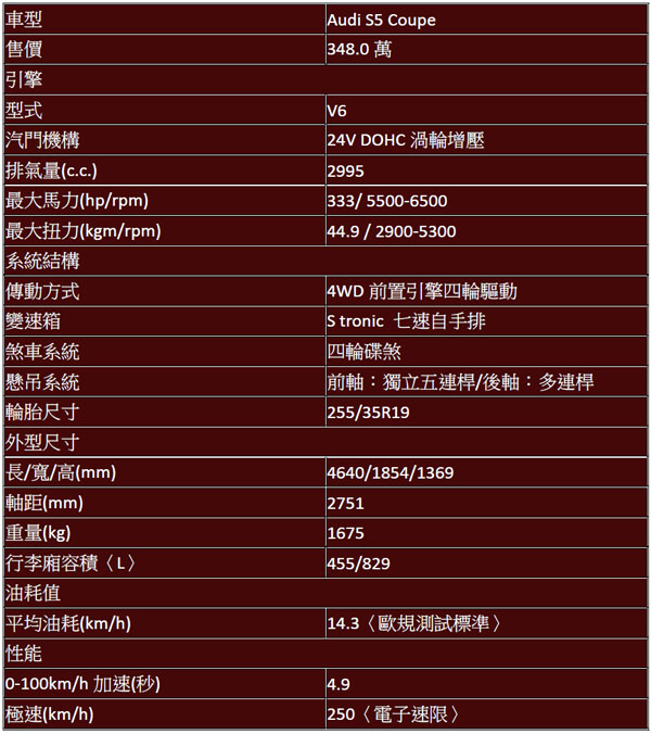 若提到豪華品牌,多數人會聯想到所謂的雙B,但是同樣來自德國的Audi卻以屬於自己地風格與造車理念,給予與多金人事不同品味的新選擇。為了在雙門跑車級距中能夠對應具有悠久歷史的BMW 3-Series Coupe,推出了A5車系,並且依循一貫的高性能陣線布局,衍生推出S5 Coupe,問世之初採用了大排氣量的4.2升V8引擎,展現澎湃氣勢,但為了進一步提升節能與整體動能效率,以及順應Downsize趨勢,將動力系統換裝3.0升V6機械增壓引擎,雖然最大馬力略為降低,但是在性能數據上卻更勝以往,而台灣奧迪也在2012年正式引進搭載新動力的小改款S5 Coupe。