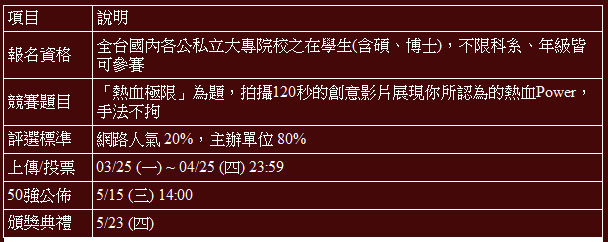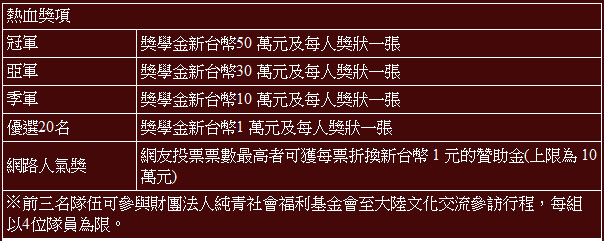 本次活動總獎金高達百萬,和泰汽車希望藉此活動鼓勵所有大專院校學生,只要勇於發揮創意,夠膽秀出自己的熱血與熱情,號召親朋好友上網人氣相挺,就有機會成為2013年的熱血極限王!