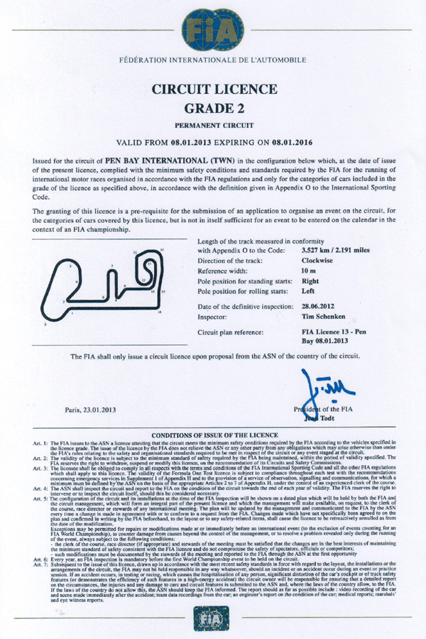 PIC在2013年一月完成了所有待完成的部分,經中華賽車會楊光榮會長親自南下視察之後,立時呈送報告給FIA,春節假期間終於收到了FIA正式通過的通知,授予FIA Grade 2的國際賽車場執照。台灣賽車運動自1993年中華賽車會成立及龍潭TIS賽車場落成,經歷整整二十年,本土賽車運動才有這一個突破性的發展,實在值得慶賀。