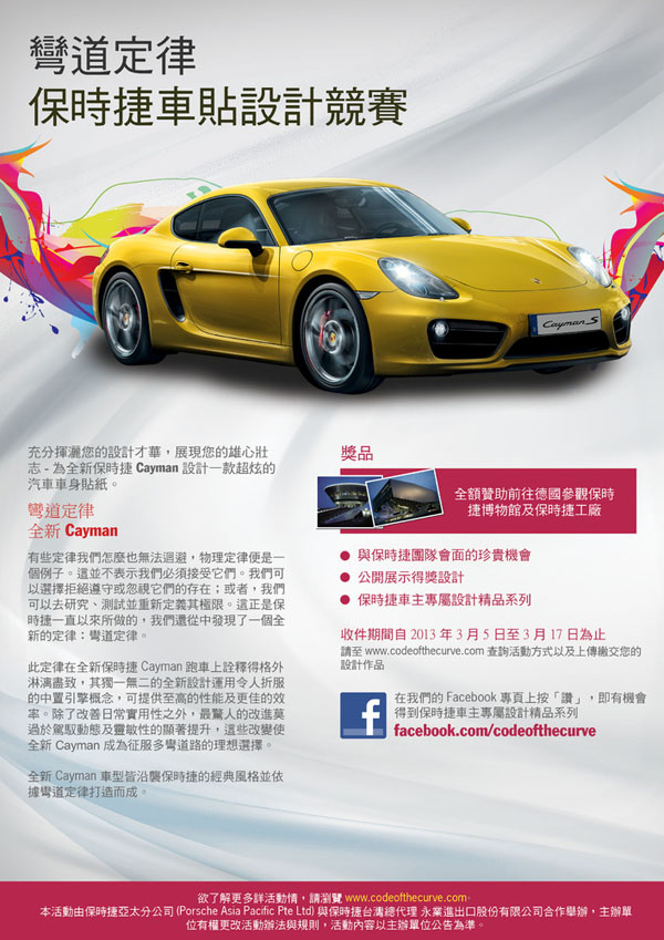 Porsche台灣總代理 永業與Porsche亞太分公司誠摯邀請設計新秀為Porsche全新 Cayman 設計車身貼紙。