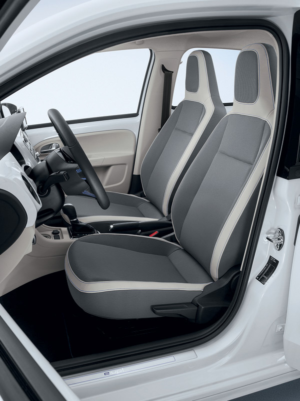 e-up!內裝以專屬的淡灰色為基調,車縫處更施以藍色縫線裝飾,而部份以皮革、與鍍鉻材質裝飾的部位,更賦予e-up!恰如其分的都會電動車印象。VW e-up!將於今年秋天的IAA法蘭克福車展上首度對外公開,隨後並提供訂車的服務。