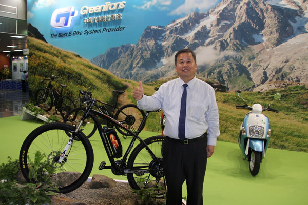 中華汽車劉興臺總經理親臨GreenTrans攤位為自行車電動套件站台。