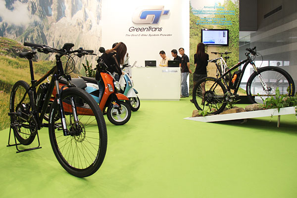 「2013台北國際自行車展」中GreenTrans除了展出最新的自行車電動套件外,原先的電動機車產品系列也有完整陳列。