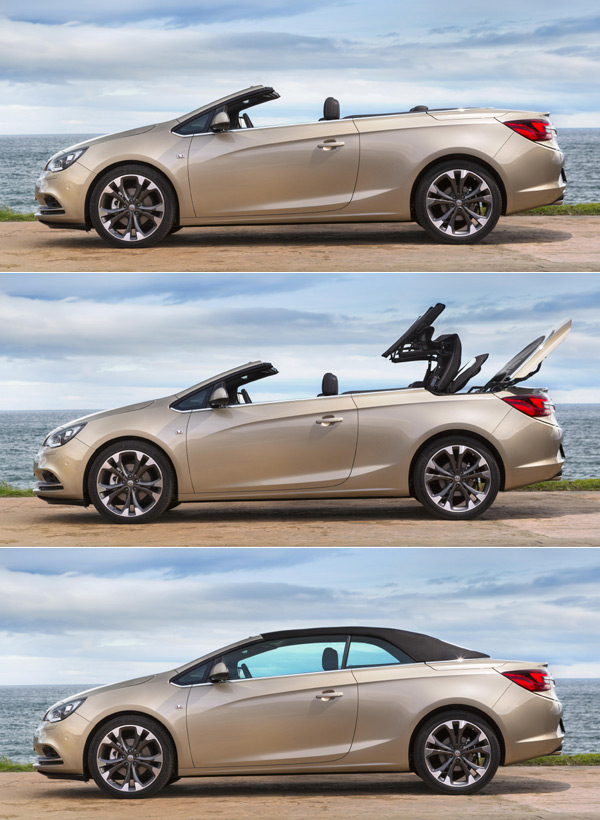 Cascada採用的織布材質頂篷,中間夾層施以兼具隔音、隔熱功能的聚酯纖維絨布,開闔動作藉由座艙內的開關操作、以電子液壓式結構作動,在車速50km/h內均可啟用,並能在17秒內完成開闔的動作;而車輛在靜止的狀態下,車主也能以鑰匙遙控,操作Cascada的頂篷開闔。