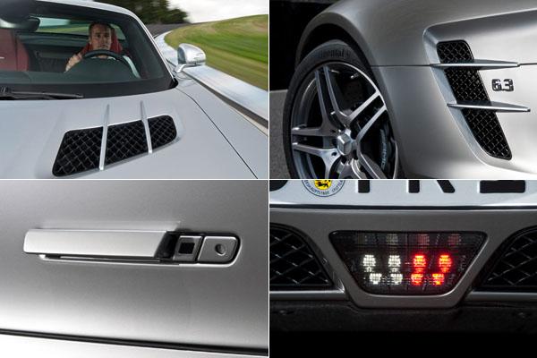 SLS AMG有著修長輪廓,搭配上低重心駕艙、前伸車頭、短捷車尾線、長軸距、寬輪距、獨特的前19吋/後20吋輪框設計、鑲嵌在前方進氣罩上的大型三芒星廠徽、以及刻飾在引擎蓋上的散熱鰭等種種令人緬懷之經典跑車元素。