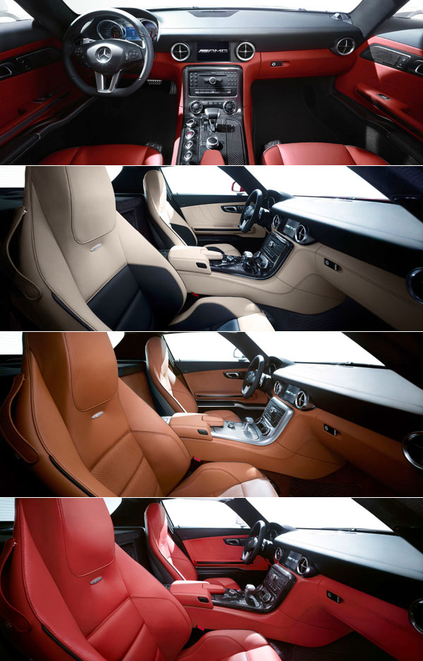 融入航空元素的SLS AMG駕艙內,風格獨具的儀表板清晰顯示功能,將所有車況訊息傳達給駕駛;神似噴射引擎造型的出風口,整合於中控面板上;位於駕艙正下方的中控台融入金屬材質,向下延伸為AMG駕馭套件的坐落基地。同時,SLS AMG採用高度極低、鎂合金材質的AMG輕量化賽車座椅,營造熱情狂放的車室氛圍;其上掀式鷗翼車門設計,開啟高度甚至低於傳統雙門跑車,在標準車庫中可以完全開啟,實用性不受影響。