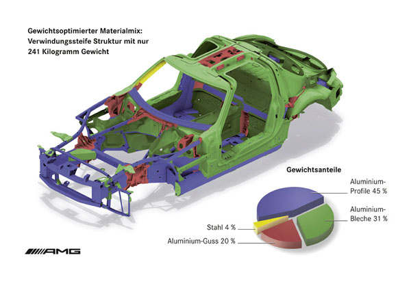 對於M-Benz而言,SLS AMG是首輛以鋁合金材質打造的量產車款,相較於傳統鋼鐵材質車身結構,鋁合金車身結構能輕易達成輕量化的目的,使得SLS AMG僅有1620kg車重。SLS AMG鋁合金立體桁架結構更能展現強韌車身剛性,並依照各部位需求採用不同屬性的鋁合金結構,導入採取複合概念,其中輕量化鋁合金車架有45%為塊狀鋁合金、31%為板狀鋁合金、20%為沖壓鑄造鋁合金、4%則混合鋼鐵材質;且為了達到最完善的乘員安全,在車身A柱特別採用超高張力鋼鐵材質。如此一來,SLS AMG車身結構重量只有241kg,可清楚了解鋁合金材質的輕量化優勢 。