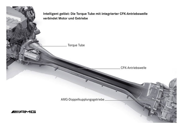 SLS AMG採用源自DTM C-Class廠車的技術,以碳纖維材質製造中央傳動軸,充分發揮輕量化與高剛性的雙重優點。為了平衡前後配重,AMG Speedshift DCT雙離合器七前速跑車變速箱坐落於後軸,連結引擎與變速箱間的管狀通道也採用碳纖維製作。