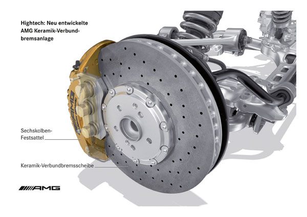 煞車系統部分,SLS AMG運用全新發展、不易衰退的陶瓷複合材質打造,即使長時間劇烈操駕也能為駕駛者帶來充分的信心。此外,此先進材質大幅減輕40%重量及有效減少簧下重量,妥善兼顧行駛舒適與抓地能力,更可以降低輪胎的滾動阻力,讓車身操控更直接敏捷。