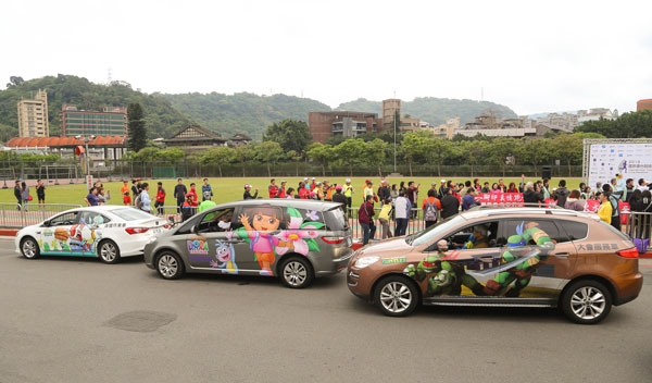 而其中最吸睛的焦點,莫過於塗裝著高人氣卡通人物肖像的Luxgen全車系前導車,包括DORA的Luxgen7 MPV、忍者龜的Luxgen7 SUV及 海綿寶寶、派大星的Luxgen5 Sedan。當前導車駛入會場時立刻引起騷動,而受到大小朋友喜愛的海綿寶寶人偶現身於前導車旁時,原本情緒難掩緊張的選手及親友團們立刻化身為熱情粉絲,紛紛拿出手機為彼此拍照留念,也藉由海綿寶寶樂觀開朗的精神,紓緩起跑線前令人屏息的氛圍,轉化成同樂會般的歡愉興奮。