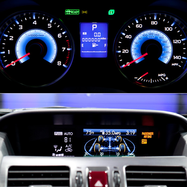 藍色背光儀表板為XV Crosstrek Hybrid專屬,中控台置頂螢幕則可顯示hybrid模組的電力傳動、以及其他各種車上機能的資訊。
