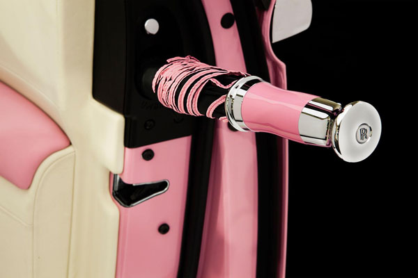 Ghost EWB FAB1 Edtion大量運用粉紅色鋪陳整輛車,外觀部分採粉紅色與銀色混搭,車內則是以米白色為基底,搭配粉紅色縫線與小羊毛地毯,並在頭枕上繡有粉紅絲帶徽飾,同時還附上了採粉紅色滾邊的抱枕與粉紅色雨傘,最後於前門檻上嵌有FAB1 Edtion銘牌以示身分。