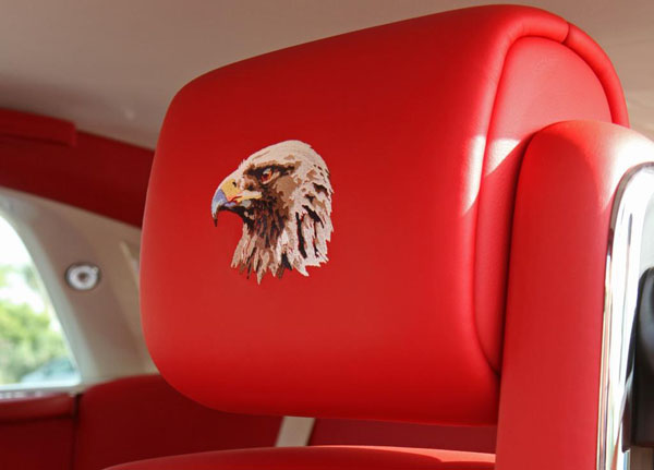 此獵鷹頭像乃是以11種不同顏色的縫線、運用21011針,將其繡在車內座椅枕頭上。