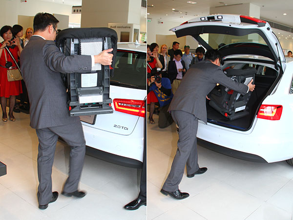 Audi Taiwan總裁邱山祥親自示範體感尾門自動開啟功能,強調此系統的便利與貼心。