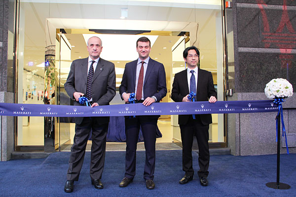 由左至右,臺灣蒙地拿總經理Fabrice De Murat、Maserati大中華區董事總經理Mr. Christian Gobber、Maserati品牌總經理黃怡超一同為Maserati台北旗艦展示中心剪綵。